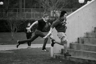 I took these two pictures a few weeks ago as part of a story on Humans vs. Zombies I was writing for the school newspaper. In situations like this getting photo caption information is like a big complicated game of Where’s Waldo. I continuously shoot photos while the action is going on around me, then, when a break comes 30 or 40 minutes later I quickly flip through the results and pick the best ones. I memorize key aspects about the subjects in those few photos, clothing, hair, etc., and scan the crowd around me to see if I can find them again. When I do I run over, corner them, and ask for all their personal information. It’s a fun game and it keeps you on your toes.