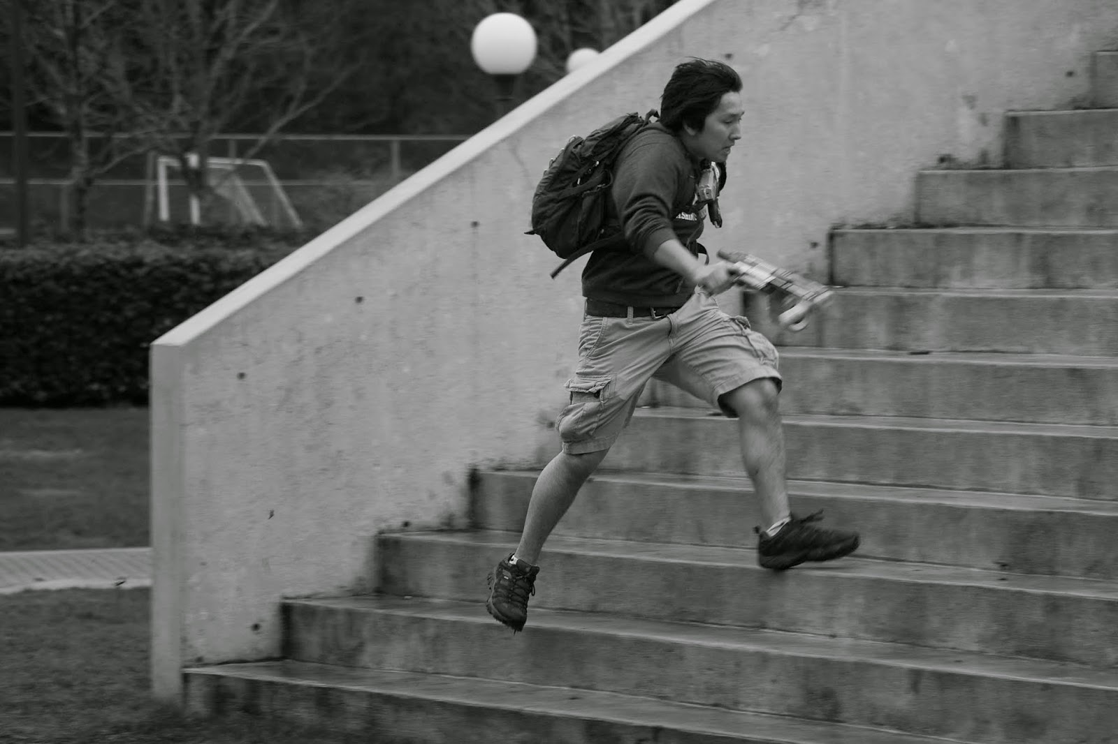 The second form of motion photo was blurred motion. This involves a longer shutter speed and a steady hand so that you can get a nice crisp background with blurry subjects rushing about in the frame. Of course, the best time to do these shots on campus is during the ten minutes in between class periods when the whole campus is flooded with students hurrying to and from class. Most of my classmates had the same idea. In fact, there was one afternoon where at least four of us were all lined up along the same path, swapping tips back and forth and waiting for the rush to start.