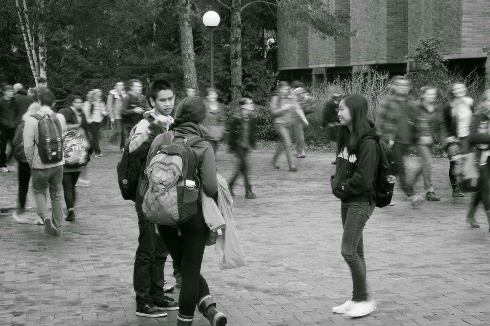 There were actually two of us from my class who submitted photos of these three students. They were standing still among the flow of people going to and from class. These blurred photos were especially tricky because I didn’t have a tripod with me. In order to get these photos to turn out I had to hold perfectly steady so that the three students would turn out crisp and clear and the people in the background would be a smooth flow.